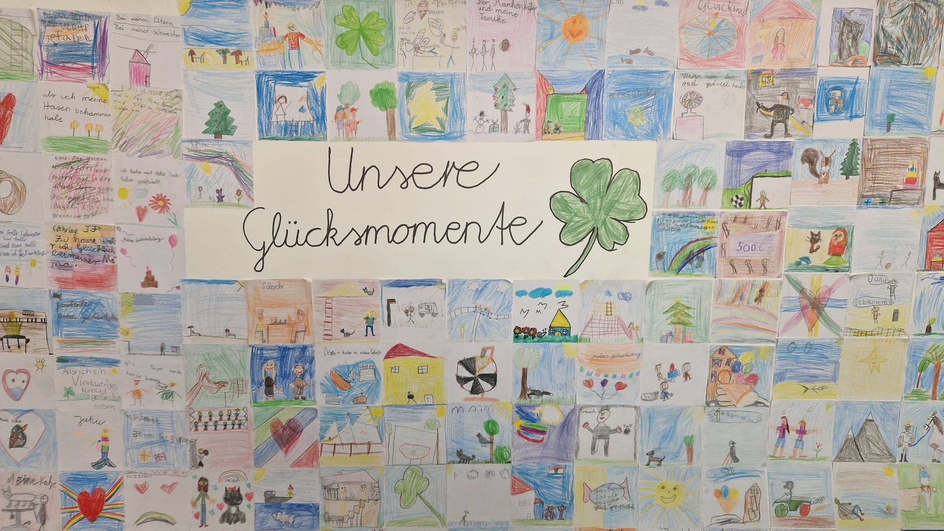 Besonders berührend war es, wie die Kinder ihre ganz persönlichen Glücksmomente festhielten. Jedes Kind führte ein eigenes Glückstagebuch, in dem es seine schönsten Erlebnisse notierte. Zusätzlich entstand ein beeindruckendes Gemeinschaftsbild, das alle individuellen Glücksmomente der Kinder zu einem großen, bunten Ganzen vereinte (siehe Foto).