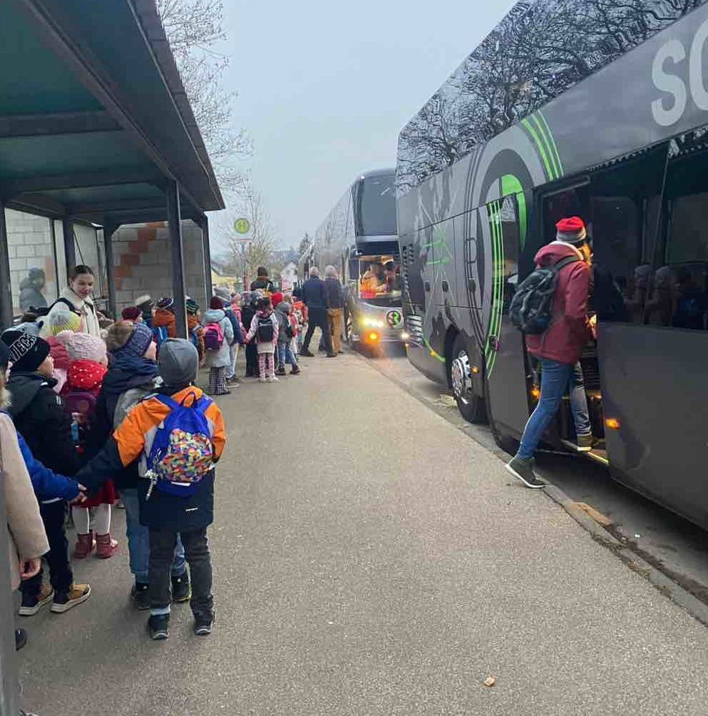 Am 13. Dezember 2024 fuhren alle Schülerinnen und Schüler der Grundschule Niederstotzingen mit ihren Lehrerinnen nach Aalen ins Theater. Für viele war schon die Fahrt mit dem Doppeldeckerbus ein Erlebnis. Aber auch dem Theaterstück „Momo“ folgten die Kinder begeistert und durften sogar ein bisschen mitspielen, indem sie mit den Schauspielern gegen die „Zeitdiebe“ demonstrierten.